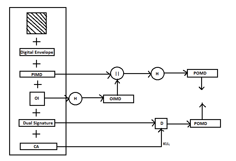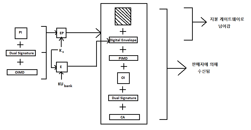 이 3가지가 더해진 것이 대칭키 암호화(EP)되어 디지털 봉투(Digital Envelope), 결제정보 메시지 다이제스트(PIMD), 주문정보(OI), 이중 서명, 고객 인증서(CA)와 더해지고 그것을 판매자가 수신하게 되는 것이다.
