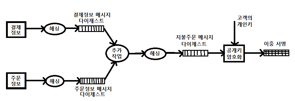 혹자는 각 정보를 별도로 보내는 것이 더 쉽고 안전한 방법이라고 생각할 수도 있을 것이다. 하지만 연결된 형식으로 보내는 것이 향후 발생할 수 있는 모든 분쟁을 해결한다. 따로 보내기에 생길 수 있는 문제가 있다는 점을 인지해야 한다. 그리고 이중 서명의 생성은 다음과 같다.