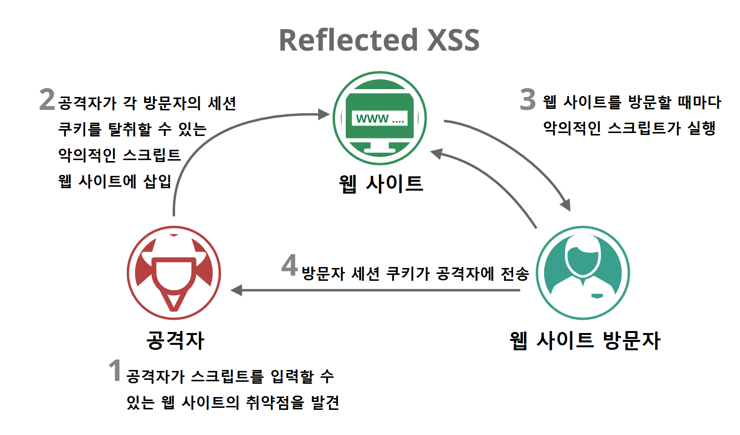 실행하기 위해 매번 입력을 제공해야 하는 경우 이러한 XSS를 reflected라고 한다. 이러한 공격은 대부분 페이로드를 피해자에게 직접 전달함으로써 수행된다. 피해자는 페이로드가 포함된 요청이 있는 페이지를 요청하고 페이로드는 스크립트로 응답에 내장된다. reflected XSS의 예로는 검색 필드의 XSS가 있다.