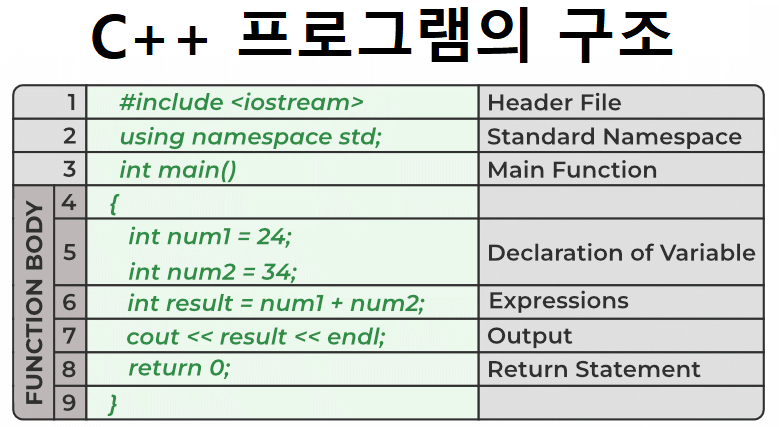 그림의 2번 행에서는 모든 표준 라이브러리 함수가 정의되는 표준 네임스페이스가 될 것임을 지정하기 위해 namespace std 문을 사용한 것이다.