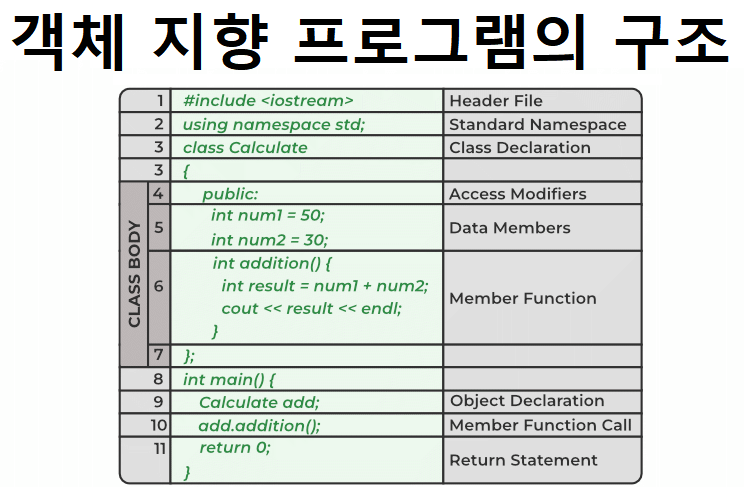 C++ 프로그래밍 언어는 절차 지향 프로그래밍과 객체 지향 프로그래밍을 모두 지원한다. 위에서 기술한 예시는 절차 지향 프로그래밍 패러다임을 기반으로 한다. 그래서 이번에는 C++에서의 객체 지향 프로그래밍에 대해 다른 예시를 들어 이해하는 시간을 갖는다.
