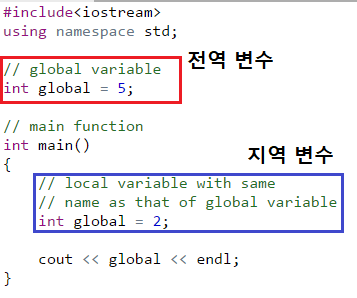 위의 프로그램에서 맨 위에 선언된 변수 "global"은 전역이며 5를 저장한다. 그리고 메인 함수 안에 선언된 변수는 지역이고 2를 저장한다. 그러면 문제는 "global"이라는 변수에 저장된 값이 메인 함수에서 언제 출력이 되는가 하는 것이다.