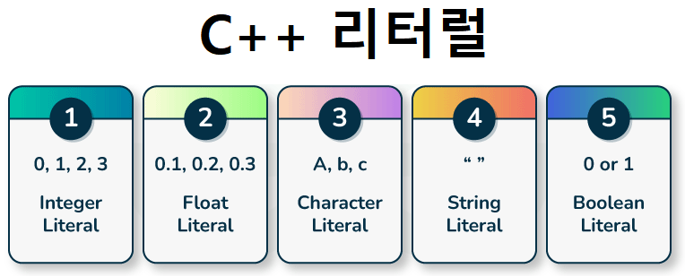 C++ 프로그래밍 언어에서 우리는 고정된 값을 나타내기 위해 리터럴을 사용한다. 즉, 상수 값을 나타내는 데 사용되는 기본 요소인 것이다. 이러한 상수에는 숫자, 문자, 문자열 등이 포함될 수 있다. 리터럴을 이해하고 사용하는 것은 데이터 할당, 계산 및 데이터 표현에 C++에서 필수적이라 할 수 있다. 이들은 일반적으로 할당 작업에서 오른쪽 피연산자로 표시된다. C++에서의 리터럴 종류로는 위 그림에서 알 수 있듯, ① 정수 리터럴 ② 부동소수점 리터럴 ③ 문자 리터럴 ④ 문자열 리터럴 ⑤ 논리 자료형 리터럴이 존재한다.