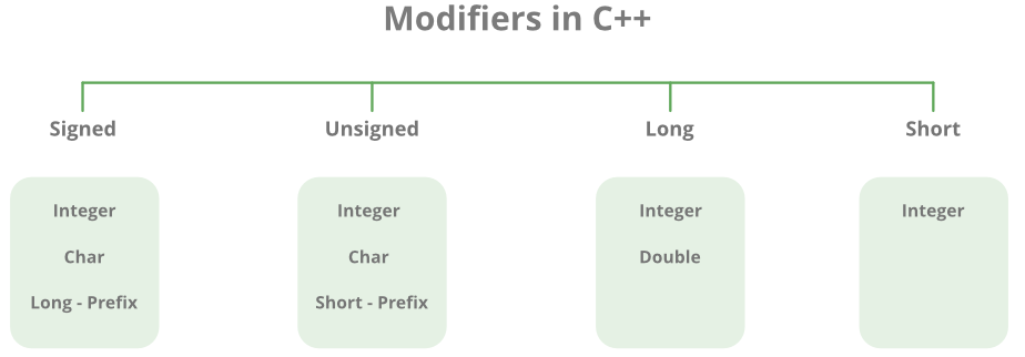 한편, C++는 다음과 같은 데이터 유형을 지원한다. 그 안의 세부 가지는 위의 그림과 같다.