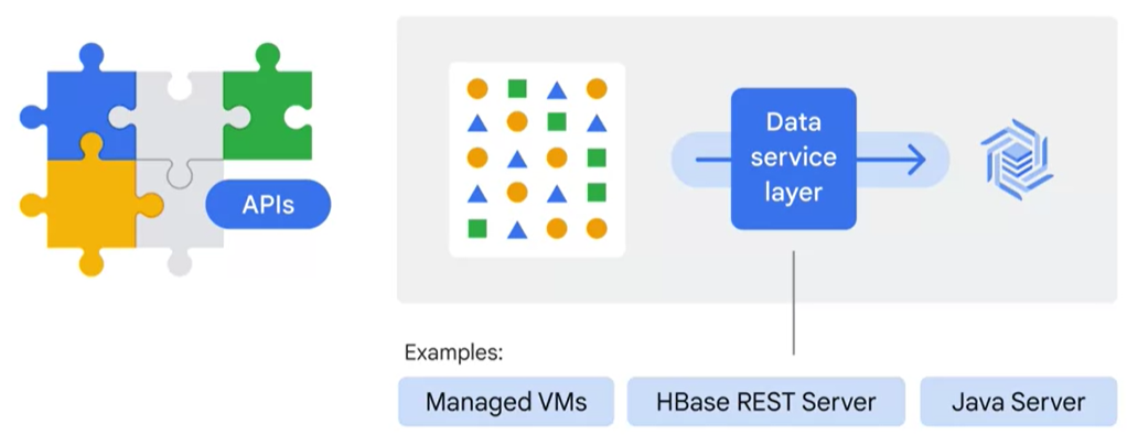 클라우드 빅테이블은 다른 구글 클라우드 서비스, 타사 클라이언트와 상호작용이 가능하다. API를 사용하면, 관리되는 VM, HBase REST 서버, 또는 HBase 클라이언트를 사용하는 자바 서버와 같은 데이터 서비스 계층을 통해 클라우드 빅테이블에서 데이터를 읽고 쓸 수 있다. 일반적으로, 이것은 애플리케이션, 대시보드, 그리고 데이터 서비스에 데이터를 제공하는 데 사용된다. 데이터는 플로우 스트리밍, 스파크 스트리밍, 그리고 스톰과 같은 다양한 인기 있는 스트림 처리 프레임워크를 통해 스트리밍될 수도 있다.