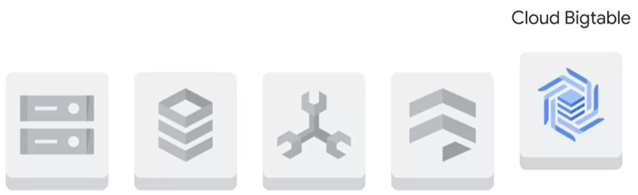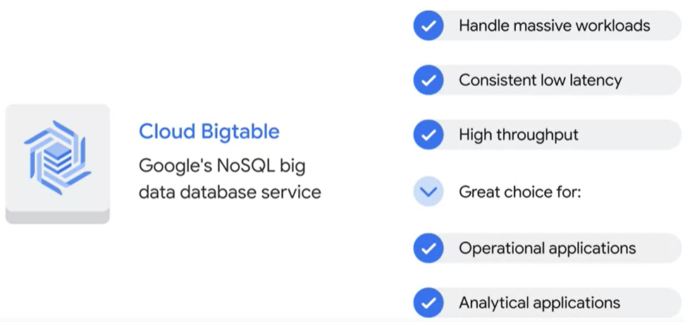 구글 클라우드의 핵심 스토리지 옵션 마지막은 클라우드 빅테이블이다. 클라우드 빅테이블은 구글의 NoSQL 빅데이터 데이터베이스 서비스다. 그것은 검색, 분석, 지도, 지메일을 포함하는 많은 핵심 구글 서비스에 힘을 주는 동일한 데이터베이스다.