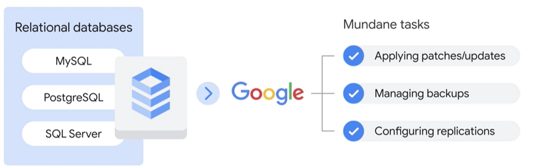 클라우드 SQL은 MySQL, PostgreSQL, 서비스로의 SQL 서버를 포함하여 완전하게 관리되는 관계형 데이터베이스를 제공한다. 그것은 패치 및 업데이트 적용, 백업 관리, 복제 구성과 같이 평범하지만 필수적이고 시간을 꽤나 잡아먹는 작업을 구글에 전달하도록 설계되어 있다. 그래서 작업자는 우수한 애플리케이션을 구축하는 데에 더욱 집중할 수 있다. 클라우드 SQL은 어떠한 소프트웨어 설치나 유지보수를 필요로 하지 않는다. 최대 128개의 프로세서 코어, 864GB의 램, 64TB의 스토리지까지 확장할 수 있다. 클라우드 SQL primary 인스턴스, 외부 primary 인스턴스, 외부 MYSQL 인스턴스와 같은 자동 복제 시나리오도 지원한다. 클라우드 SQL은 백업을 지원하므로, 백업된 데이터가 안전하게 저장되고, 복구가 필요하다면 엑세스할 수도 있다. 인스턴스 비용은 7개의 백업을 포함한다. 클라우드 SQL은 구글 내부 네트워크에 있을 때와 데이터베이스 테이블, 임시 파일, 그리고 백업에 저장될 때 고객의 데이터를 암호화한다. 그리고 그것은 네트워크 방화벽을 포함하여 각 데이터베이스 인스턴스에 대해 네트워크 엑세스를 제어할 수 있다. 클라우드 SQL 인스턴스의 장점은 다른 구글 클라우드 서비스, 그리고 심지어는 외부 서비스에 의해서도 엑세스가 가능하다는 것이다. 클라우드 SQL은 자바용 Connector/J 또는 파이썬용 MYSQLdb와 같은 표준 드라이버를 사용하여 앱 엔진과 함께 사용할 수 있다. 컴퓨트 엔진 인스턴스는 클라우드 SQL 인스턴스에 엑세스하고 클라우드 SQL 인스턴스를 가상 머신과 동일한 구역에 구성하도록 권한을 부여할 수 있다.