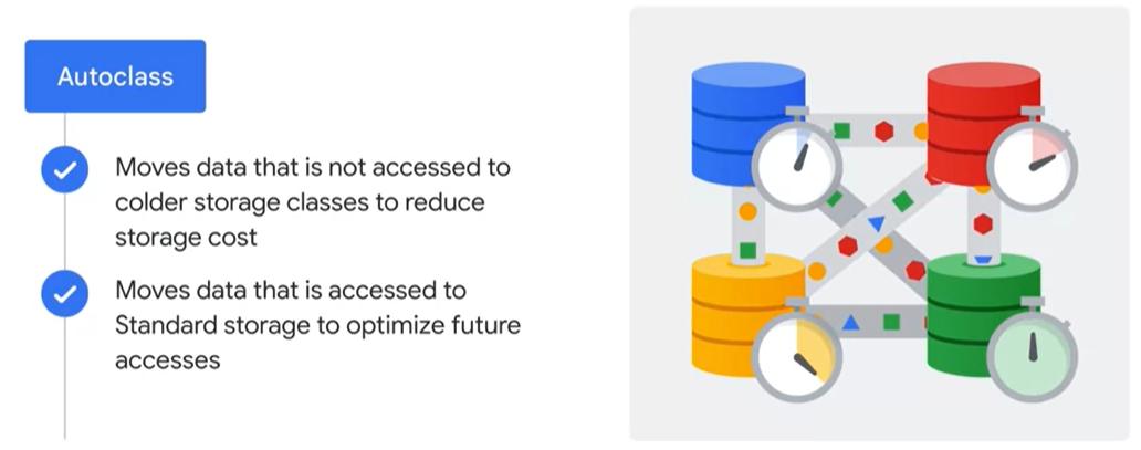 또한, 클라우드 스토리지는 자동 클래스라는 기능을 제공하는데, 이것은 각 객체의 엑세스 패턴에 따라 객체를 그에 적절한 스토리지로 자동적으로 전환하는 것이다. 이 기능은 더 차가운 스토리지 클래스에 엑세스할 수 없는 데이터를 이동시킴으로써 스토리지 비용을 절감하고, 스탠다드 스토리지에 엑세스할 수 있는 데이터를 이동시켜 향후 엑세스를 최적화한다. 자동 클래스는 우리의 클라우드 스토리지 데이터에 대한 비용 절감을 단순화하고 자동화하는 것이다. 클라우드 스토리지는 사용한 것에 대해서만 값을 지불하기 때문에 최소 지불액 개념이 없다. 그리고 용량의 사전 프로비저닝은 필요치 않다. 클라우드 스토리지는 언제나 추가적인 비용 없이 디스크에 쓰여지기 전에 항상 서버 측의 데이터를 암호화한다. 고객의 기기와 구글 간에 이동하는 데이터는 기본적으로 전송 계층 보안인 HTTPS/TLS를 사용하여 암호화된다.