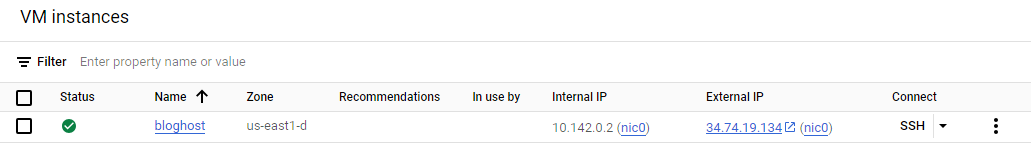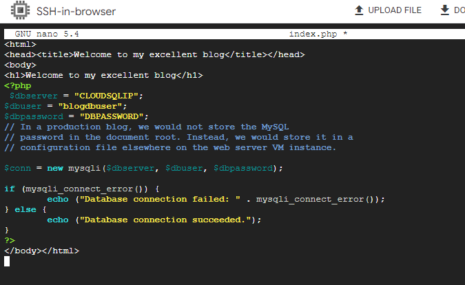 이제 컴퓨트 엔진 인스턴스에서 클라우드 SQL을 사용하도록 애플리케이션을 구성한다. SSH 편집을 해주고, 새 창에서 VM 인스턴스의 외부 주소로 들어가게 되면 데이터베이스 연결 실패 메시지가 뜨는 것을 볼 수 있다. 이는 위에서 내가 CLOUDSQLIP와 DB패스워드 부분을 수정해주지 않았기 때문이다. 여기에는 내가 위에서 알아둔 SQL 인스턴스의 공용 IP를 입력한다. 그리고 다시 VM 인스턴스의 외부 주소로 들어가게 되면, 드디어 데이터 연결이 성공적이라는 문구를 볼 수 있다. 실제 블로그에서는 데이터베이스 연결 상태를 블로그 방문자가 볼 수는 없다. 대신, 관리자만 그것을 보며 관리할 수 있다는 점을 알아두자.