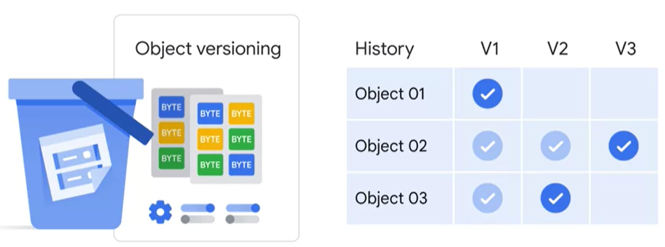 관리자는 각 새 버전이 이전 버전을 완전히 덮어쓰도록 허용하거나, 버킷 내에서 '버저닝'을 사용할 수 있도록 하여 특정 객체가 변경된 각 버전을 추적할 수 있다. 만약 우리가 버저닝을 선택할 경우, 클라우드 스토리지는 해당 버킷에 포함된 모든 객체에 대한 수정, 즉 덮어쓰기나 삭제에 대한 상세한 역사를 유지할 것이다. 만일 객체 버저닝을 설정하지 않으면, 기본적으로 새 버전은 언제나 이전 버전을 덮어쓸 것이다.
