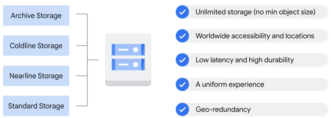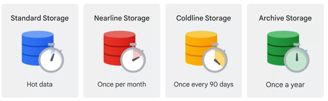 클라우드 스토리지에는 4개의 주요 스토리지 클래스가 존재한다. 첫 번째는 스탠다드 스토리지다. 스탠다드 스토리지는 빈번하게 엑세스하는 핫 데이터에 가장 적합하다. 또한, 짧은 시간 동안에만 저장되는 데이터에도 매우 적합하다. 두 번째는 니어라인 스토리지다. 이것은 평균적으로 한 달에 1번 또는 그 이하로 데이터를 읽거나 수정하는 것과 같이, 자주 엑세스하지는 않는 데이터를 저장하는 데 가장 적합하다. 예를 들어, 데이터 백업, 장기 멀티미디어 콘텐츠, 또는 데이터 기록이 포함될 수 있다. 세 번째는 콜드라인 스토리지다. 이것은 자주 엑세스하지 않는 데이터를 저장하기 위한 저렴한 옵션이다. 니어라인 스토리지와 대조하면, 콜드라인 스토리지는 최대 90일에 1번 데이터를 읽거나 수정하기 위한 용도다. 마지막으로 네 번째는 아카이브 스토리지다. 이는 데이터 기록, 온라인 백업, 재해 복구에 있어 이상적으로 사용되는 최저 비용 옵션이다. 365일의 최소 저장 기간에서 데이터 엑세스와 운영에 대한 비용이 높기 때문에 1년에 1번 미만으로 엑세스할 계획이 있는 데이터에 가장 적합한 선택이다.