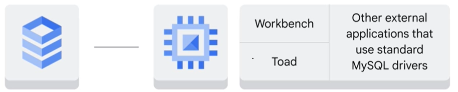 클라우드 SQL은 또한 SQL 워크벤치, Toad, 그리고 표준 MYSQL 드라이버를 사용하는 다른 외부 애플리케이션들과 같이 우리가 사용할 만한 도구와 애플리케이션을 지원한다.