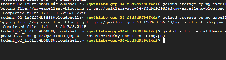 이번엔 gcloud 스토리지 명령줄을 이용하여 클라우드 버킷을 생성한다. 클라우드 스토리지 버킷은 미국, EU, 아시아의 리전 또는 멀티 리전과 연결될 수 있다. 나는 클라우드 셸을 활성화하고, 사전에 배정된 것에 따라 지역으로 US를 입력했다. 그런 다음 프로젝트의 ID를 딴 버킷을 생성했다.다음 엑세스하기 위한 배너 검색을 하고, 새로 만든 클라우드 스토리지 버킷에 배너 이미지를 복사했다. 그리고 ACL을 수정하여 모든 사용자가 읽을 수 있게 하였다.