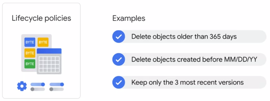 대량의 객체 데이터를 저장하고 되찾는 것에 들어가는 비용이 빠르게 늘어날 수 있기 때문에, 클라우드 스토리지는 또한 라이프사이클 관리 정책도 제공한다. 예를 들어, 클라우드 스토리지에 365일도 더 지난 객체를 삭제하거나, 2013년 1월 1일 이전에 생성된 객체를 삭제하거나, 버저닝을 사용하도록 설정된 버킷에 각 개체의 최신 버전 3개만 저장하도록 지시할 수 있다. 이런 제어를 통해 우리는 실제 필요한 것 이상의 비용을 지불하지 않도록 보장받는다.