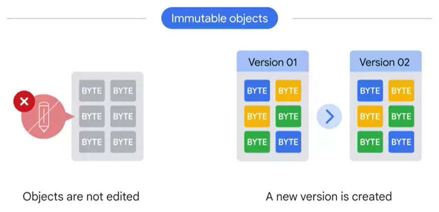 클라우드 스토리지에서 제공되는 스토리지 객체는 변경할 수 없고, 따라서 우리는 이것을 수정할 수 없다. 대신, 매번 변경이 있을 때마다 새 버전이 생성된다.