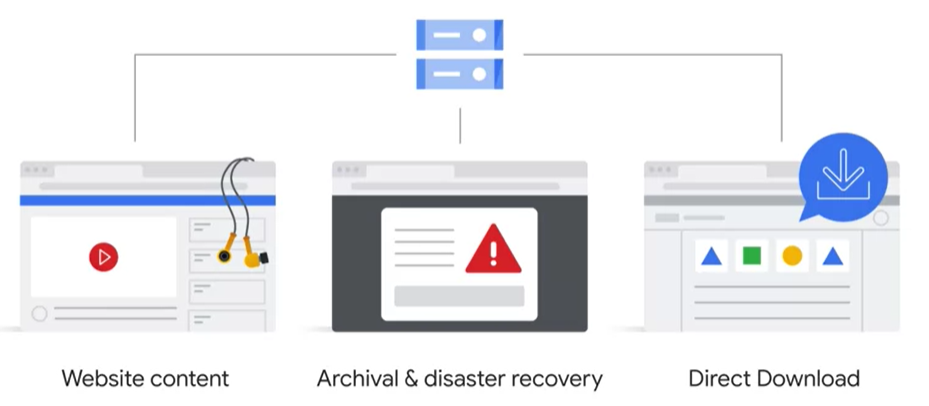 웹 사이트 콘텐츠 서비스, 기록용 혹은 재해 복구를 위한 데이터 저장, 다이렉트 다운로드를 통해 최종 사용자에게 대용량의 데이터 객체를 배포하는 것들이 그것의 예시에 속한다. 클라우드 스토리지의 주요 용도는 비디오, 사진 같은 온라인 콘텐츠, 백업과 아카이브 데이터, 일을 처리하는 중에 중간 결과를 저장하기 위해 바이너리 대용량 객체 스토리지(BLOB)가 필요할 때다. 클라우드 스토리지 파일은 버킷으로 구성된다. 여기서 버킷은 데이터를 담는 기본 컨테이너다. 클라우드 스토리지에 저장하는 모든 컨테이너가 버킷에 포함되어야 한다.