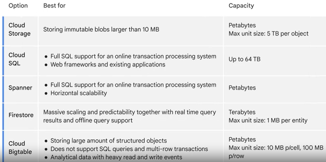 큰 이미지나 영화와 같이 10MB 이상의 수정 불가능한 blob를 저장해야 하는 경우, 클라우드 스토리지를 사용하는 것을 고려해볼 수 있다. 이 스토리지 서비스는 페타바이트 용량을 제공하며, 객체당 최대 단위 크기는 5TB다. 온라인 트랜잭션 처리 시스템에 대한 전체 SQL 지원이 필요한 경우, 클라우드 SQL이나 클라우드 스패너의 사용을 고려해볼 수 있다. 클라우드 SQL은 머신 유형에 따라 최대 64TB를 제공하며, 클라우드 스패너는 페타바이트를 제공한다. 클라우드 SQL은 사용자 자격증명과 고객 주문을 저장하는 것과 같은 웹 프레임워크와 기존 애플리케이션에 있어 최고의 선택이라 할 수 있다. 만일 단순히 사본을 읽기 뿐 아니라, 수평적 확장성이 필요해서 클라우드 SQL이 요구사항에 적합하지 않는다면, 그때는 클라우드 스패너 사용을 고려해보는 것이 좋다. 실시간 쿼리 결과와 오프라인 쿼리 지원과 함께 대규모 확장과 예측가능성이 필요한 경우에는 파이어스토어 사용을 고려하는 것이 좋다. 이 스토리지 서비스는 엔티티당 최대 단위 크기가 1MB인 테라바이트 용량을 제공한다. 파이어스토어는 모바일과 웹 앱들을 위한 데이터를 저장하고, 동기화하고, 쿼리하는 데 있어 가장 적합하다. 마지막으로, 수많은 정형 객체를 저장해야 하는 경우 클라우드 빅테이블 사용을 고려하는 것이 좋다. 클라우드 빅테이블은 SQL 쿼리를 지원하지 않으며, 멀티-로우 트랜잭션도 지원하지 않는다. 이 스토리지 서비스는 셀당 10MB, 로우당 100MB의 최대 단위 크기로 페타바이트의 용량을 제공한다. 빅테이블은 애드테크, 금융, 또는 IoT 데이터와 같이 읽기, 쓰기 이벤트가 아주 많은 분석형 데이터에 가장 적합하다. 애플리케이션에 따라 이러한 서비스들 중 하나 혹은 여러 개를 선택하여 작업을 수행할 수 있을 것이다.