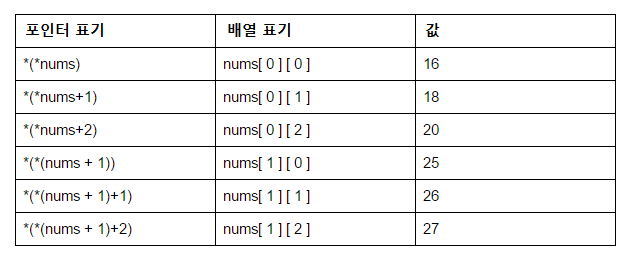 일반적으로, nums[ i ][ j ] 는 *(*(nums+i)+j) 와 같다.