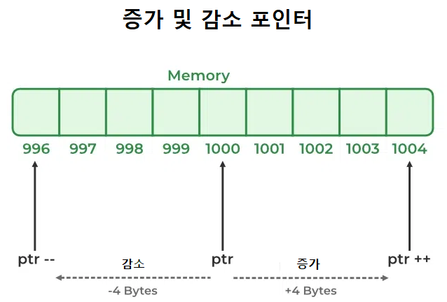 예를 들어, 포인터가 주소 1000을 유지할 때 포인터를 늘리면, 포인터가 4바이트 또는 8바이트씩 증가하고, 포인터는 이제 주소 1004를 유지하게 된다.