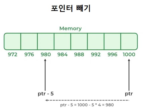 포인터에서 상수를 뺄 수도 있는데, 이는 포인터에 상수를 더하는 것과 같은 이치로 이해하면 된다. 예를 들어, 정수 포인터가 주소 1000을 저장하고 우리가 포인터에서 값 5를 빼면 새 주소는 다음과 같이 저장된다: