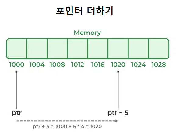포인터에 정수 값을 추가할 수 있으며, 포인터는 포인터가 가리키는 데이터 유형의 크기에 따라 조정된다. 예를 들어, 정수 포인터가 주소 1000을 저장하고 값 5를 포인터에 추가하면, 다음과 같이 새 주소가 저장된다: