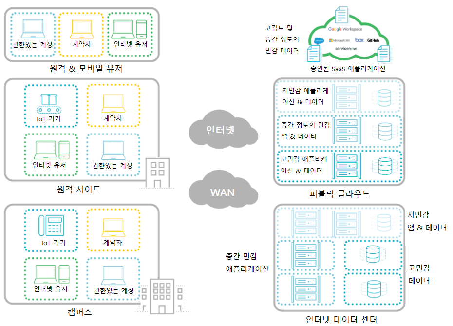 위 그림에 표시된 제로 트러스트 개념 아키텍처의 주요 구성 요소는 다음과 같다.