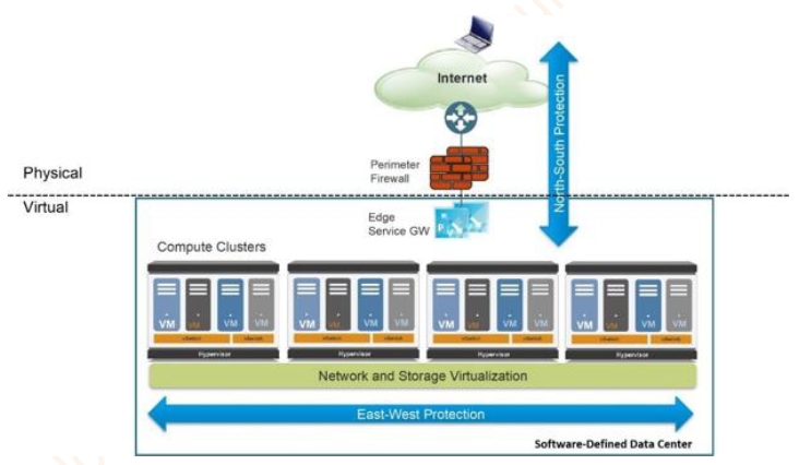 호스트 네트워크 또는 해당하는 전통적인 데이터 센터에서 가상화된 환경으로 드나드는 데이터 패킷을 말한다. North-South 트래픽은 하나 이상의 물리적 폼 팩터 경계 에지 방화벽에 의해 보안된다. 에지 방화벽은 보통 복원력을 높이기 위해 고가용성 액티브/액티브 또는 액티브/패시브 모드에서 작동하는 고처리량 어플라이언스다. 데이터 센터로 도달하는 모든 트래픽을 제어하고, 허용된 패킷과 "깨끗한" 패킷만 가상화된 환경으로 유입되도록 승인한다.