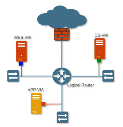 프라이빗 클라우드에서 일반적인 방법 중 하나는 VM을 서로 다른 계층으로 격리하는 것이다. 격리는 애플리케이션 기능을 명확하게 설명하고, 보안 팀이 보안 정책을 쉽게 구현할 수 있도록 한다. 격리는 논리적 네트워크 속성(ex. VLAN 또는 VXLAN) 또는 논리적 소프트웨어 구성체(ex. 보안 그룹)를 사용하여 이루어진다. 아래 그림은 프론트엔드인 WEB-VM, 애플리케이션인 APP-VM, 데이터베이스 서비스를 제공하는 DB-VM으로 구성된 간단한 3계층 애플리케이션을 보여준다.