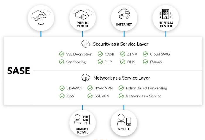 SASE 솔루션은 네트워킹 및 보안 서비스를 다음을 포함하는 하나의 통합 클라우드 제공 솔루션으로 통합한다.