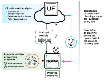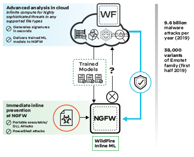 팔로알토 네트웍스는 세계 최초로 ML 기반 차세대 방화벽(NGFW)을 제공하여, 알려지지 않은 파일 및 웹 기반 위협을 차단하는 인라인 머신 러닝(ML)을 제공한다. 특허 받은 서명 없는 접근 방식을 사용하여 WildFire 및 URL 필터링은 비즈니스 생산성을 손상시키지 않으면서, 무기화된 파일, 자격 증명 피싱 및 악의적인 스크립트를 사전에 방지한다. 팔로알토 네트웍스 하드웨어 및 가상 NGFW는 새로운 ML 기반 방지 기능을 적용할 수 있다.