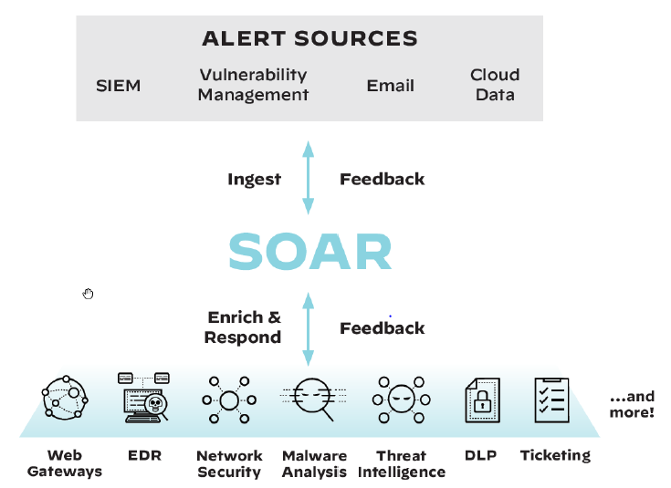가트너에 따르면, SOAR는 조직이 보안 운영 팀이 모니터링하는 입력을 수집할 수 있도록 지원하는 기술을 말한다. 예를 들어, SIEM 시스템 및 기타 보안 기술의 경고는 인력과 기계 전력의 조합을 활용하여 사고 분석 및 분류를 수행하는 데 도움이 되며, 표준화된 사고 대응 활동을 정의하고 우선 순위를 지정하고 추진할 수 있는 것이다. SOAR 도구를 사용하면 조직이 디지털 워크플로우 형식으로 사고 분석 및 대응 절차를 정의할 수 있다.