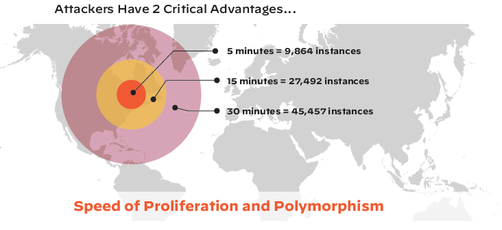 공격자들은 성공하고 있다. 2019년에는 1억 4천만 개 이상의 새로운 멀웨어 샘플이 확인되었으며, 매일 수천 개의 새로운 악성 웹 사이트와 도메인이 생성되었다. 새로운 공격은 기존의 샌드박스, 프록시 및 독립 서명 기술이 보호를 배포할 수 있는 것보다 훨씬 더 빠르게 시작되고 있으며, 이는 단순히 보조를 맞출 수 없다. 현대의 멀웨어는 초기 감염 후 보호 조치가 개발되고 조직 전반에 걸쳐 확장되기 훨씬 전에 몇 초 이내에 수천 개의 시스템을 더 감염시킬 수 있다.