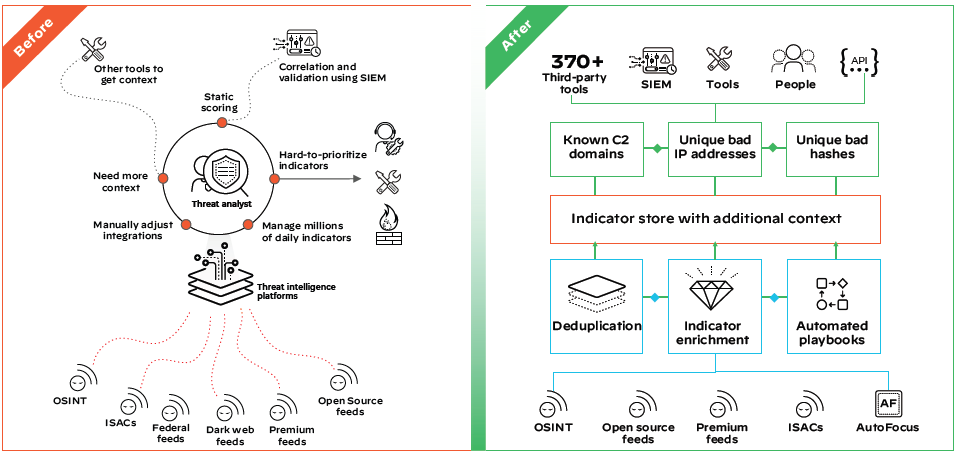 ① 자동화된 플레이북으로 수동 작업을 제거하여 여러 피드 소스에서 수백만 개의 일일 지표를 집계, 구문 분석, 중복 제거 및 관리한다. 이어 IOC 채점을 쉽게 확장하고 편집한다. 그리고 특정 환경에 가장 적합한 지표를 가진 공급자를 찾는다.