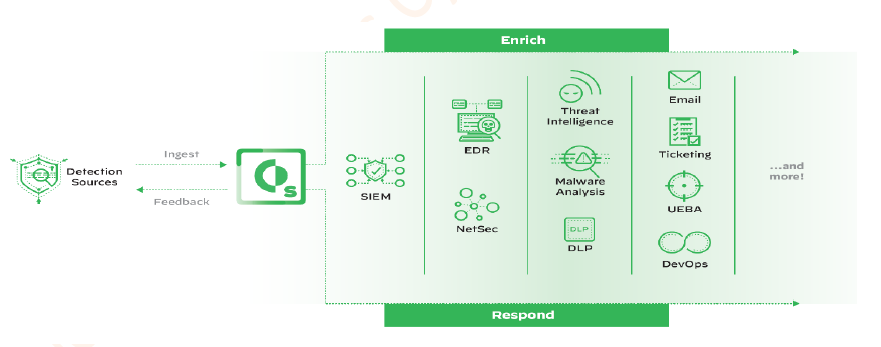 Cortex XSOAR는 보안 정보 및 이벤트 관리(SIEM) 솔루션, 네트워크 보안 도구, 위협 인텔리전스 피드 및 우편함과 같은 탐지 소스에서 통합 경고 및 절충 표시(IoC)를 수집한 후 자동화되고 프로세스 중심의 플레이북을 실행하여 이러한 사고에 풍부하게 대응한다. 이러한 플레이북은 중앙 집중식 데이터 가시성 및 조치를 위해 기술, 보안 팀 및 외부 사용자 간에 조정된다.