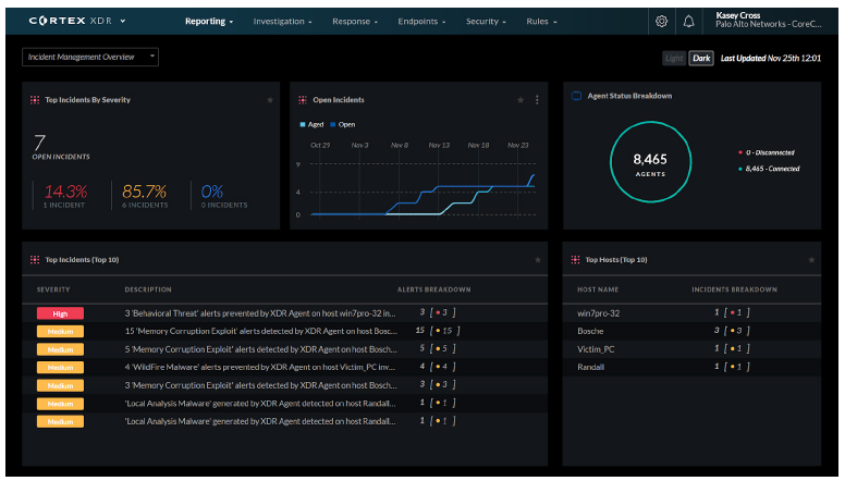 원활한 플랫폼 경험으로 생산성을 극대화한다. 관리 콘솔은 엔드포인트 정책 관리, 탐지, 조사 및 대응을 포함한 모든 Cortex XDR 기능을 엔드 투 엔드로 지원한다. 사용자 정의 가능한 대시보드를 통해 조직 또는 개별 엔드포인트의 보안 상태를 신속하게 평가하고, 주문형으로 예약하거나 생성할 수 있는 그래픽 보고서를 통해 인시던트 및 보안 동향을 요약할 수 있다. 공용 API는 관리를 타사 도구로 확장하여 원하는 관리 플랫폼에서 인시던트를 검색 및 업데이트하고, 에이전트 정보를 수집하며 엔드포인트 위협을 포함할 수 있도록 한다.