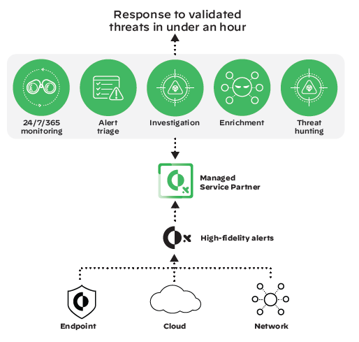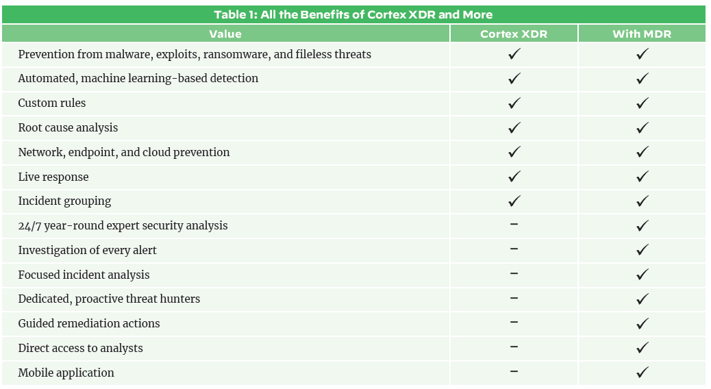 조직은 자체 보안 운영 센터(SOC)를 구축하거나 정제하는 수고스러운 과정을 피하면서, MDR(Managed Detection and Response) 서비스를 획득함으로써 보안 측면에서 긍정적인 결과를 보다 신속하게 실현한다. 팔로알토 네트웍스는 업계 최고의 MDR 서비스 제공업체와 협력하여 경험이 풍부한 분석가, 성숙한 운영 프로세스 및 시장을 선도하는 보안 제품을 가장 포괄적으로 조합하여 제공한다. 이러한 파트너십은 다음과 같은 이점을 제공한다.