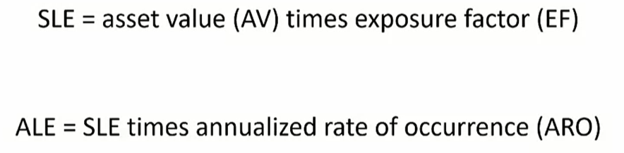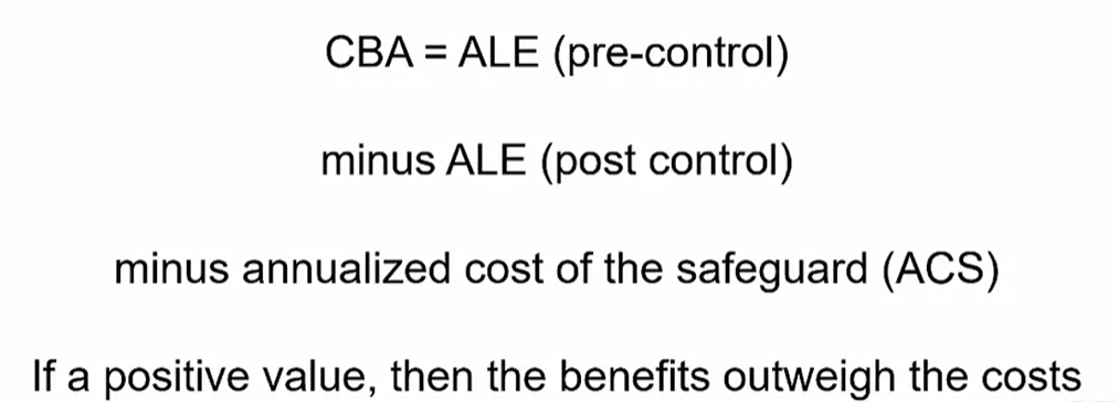 새로운 컨트롤에 대한 비용 편익 분석을 계산하는 한 가지 방법은 정보 자산의 가치를 계산하는 것부터 시작한다. 조직은 정보 자산의 총 소유 비용을 고려해야 한다. 여기에는 획득 비용, 구축하는 경우 구축하는 비용, 유지 관리 비용, 보호하는 비용 및 다음 번에 손실되거나 파괴되는 경우 복구하는 비용이 포함된다. 다음으로 연간화된 손실 기대치를 계산하는데, 이는 연간 기준으로 조정하면 일정 기간 동안 손실될 것으로 예상되는 자산의 양이다. 먼저 단일 손실 기대치를 결정하는 것부터 시작한다. 이는 특정 공격이 한 번 발생했을 때 손실될 가능성이 가장 높은 것과 관련된 계산 값이다. 이는 영향력으로, 자산의 가치와 특정 공격으로 인해 발생할 것으로 예상되는 손실 비율을 모두 고려한다. 따라서 SLE 또는 단일 손실 기대치는 자산 가치에 노출 요소를 곱한 값과 같다.