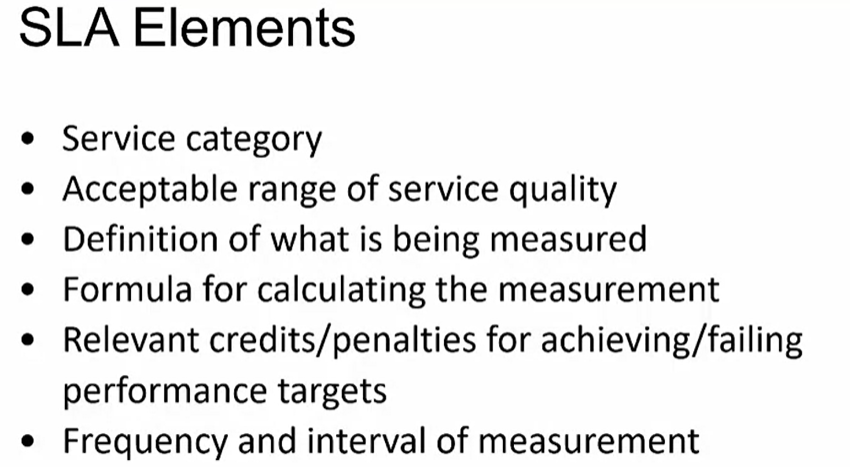 연방 예금 보험 회사가 기술 제공자를 관리하는 문서 도구에 따르면, 성과 위험 서비스 수준 계약은 다음과 같은 요소를 포함해야 한다. 일반적인 SLA에는 위의 그림과 같은 요소가 포함되어야 한다. 서비스 범주, 측정되는 것에 대한 서비스 품질 정의의 허용 가능한 범위, 측정 관련 크레딧을 계산하기 위한 공식, 성과 목표 달성 또는 실패에 대한 페널티, 측정 빈도 및 간격이 있다. 이러한 권장 사항은 쉽게 적용 가능하고 거의 모든 조직에 쉽게 적용할 수 있다. 기관의 전략적 비즈니스 요구사항을 검토하는 작업에는 일상적인 운영 환경, 위험 요소 및 시장 상황을 평가하는 작업이 포함된다. 그리고 아웃소싱 서비스가 조직의 전반적인 전략 계획에 어떻게 부합하는지에 대해 고려해야 한다. 예를 들어, 운영 효율성을 개선해야 할 필요성, 비용 절감 또는 보안 강화와 같은 요구사항을 정의하면 기관이 성능 요구사항을 정의하는 데 도움이 된다. 또한 조직이 아웃소싱 활동에 대한 전략적 목표와 목표를 달성하기 위해 서비스 제공자에게 필요한 서비스 수준을 파악하는 데 도움이 될 것이다. 전략적 요구와 운영 목표가 정의되면 설정, 측정, 명확하고 공정한 측정 또는 메트릭을 개발할 수 있다. 이러한 메트릭은 필요한 서비스 수준이 달성되었는지, 목표와 전략적 의도가 충족되었는지 확인하는 데 사용된다. 마지막으로 설명 책임을 설정하려면 메트릭이 명확하게 정의된 후 설명 책임을 보장할 프레임워크를 개발하고 채택하는 것이 유용하다. 서비스 제공자는 모든 작업에 대해 완전한 설명과 책임을 지는 경우가 거의 없다. 설명 책임을 설정하는 데는 일반적으로 결과에 대한 명확한 진술이 포함된다. 물론 아웃소싱에 자체 위험이 없는 것은 아니다. 아웃소싱 계약의 요구 사항이 충분하고 필요한 곳에 충족되었는지 여부는 정보 자산 IT 관리 및 정보 보안 팀의 소유자에게 달려 있다.