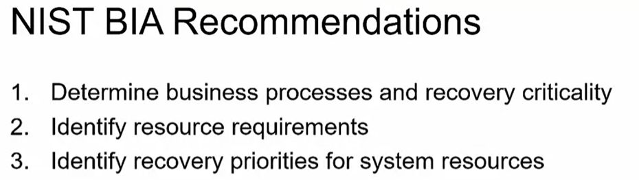 첫 번째 주요 BIA 작업은 조직의 미션과의 관계를 기반으로 조직 내 비즈니스 프로세스의 우선 순위를 분석하는 것이다. 각 비즈니스 부서, 유닛 또는 부서는 그 기능이 조직 전체에 얼마나 중요한지를 결정하기 위해 독립적으로 평가되어야 한다. 가중치 표 분석을 사용하여 해당 분석에 필요한 비즈니스 영향 정보를 수집하는 데 사용되는 BIA 설문지 및 도구의 프로세스 우선 순위 목록을 개발할 수 있다. 방금 설명한 분석을 위해 비즈니스 기능에 대한 정보를 식별하고 수집하는 도구로 유용하다. 또한 기능 관리자가 통제 가능한 영역 내의 비즈니스 프로세스, 비즈니스에 미치는 영향 및 기능에 대해 존재하는 종속성에 대한 정보를 특정 리소스 및 외부 서비스 공급자로부터 직접 입력할 수 있도록 하는 데 사용할 수 있다. 조직이 복구 중요도를 고려할 때 주요 복구 조치는 일반적으로 지정된 기간 내에 얼마나 많은 자산을 복구해야 하는지에 따라 설명된다. 이 값을 설명하는 데 사용되는 용어는 최대 허용 다운타임 또는 MTD다. 이는 시스템 소유자 또는 권한 부여 담당자가 비즈니스 프로세스 중단 또는 중단에 대해 수용할 의사가 있는 총 시간이다. MTD에는 모든 영향 고려 사항이 포함된다. 그리고 복구 지점 목표도 존재한다. 이는 중단 또는 시스템 중단이 발생한 후 가장 최근의 데이터 백업 복사본을 감안할 때 비즈니스 프로세스 데이터를 복구할 수 있는 시점이다. 복구 시간 목표, RTO는 시스템 리소스가 다른 시스템 리소스, 지원되는 비즈니스 프로세스에 허용할 수 없는 영향을 미치기 전에 시스템 리소스를 사용할 수 없는 상태로 유지할 수 있는 최대 시간 및 허용 가능한 최대 다운타임이다. 마지막으로 작업 복구 시간인 WRT가 있다. 이는 기술 요소가 복구된 후 비즈니스 기능이 다시 작동하도록 하는 데 필요한 경과된 시간으로 표현된 노력의 양이다. 이 복구 시간은 RTO에 의해 식별된다.
