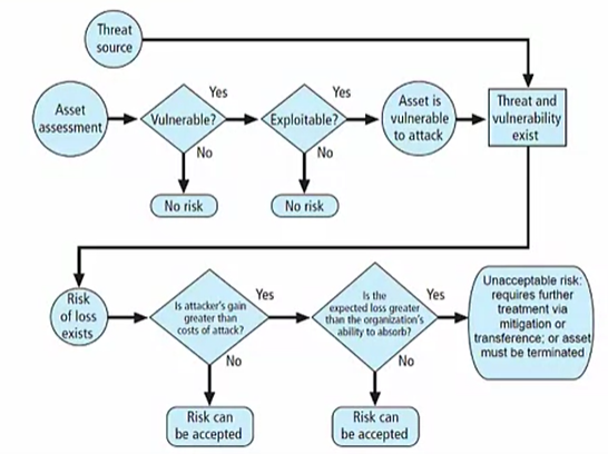 이 다이어그램에서 볼 수 있듯, 정보 시스템이 설계된 후 조직은 시스템에 악용될 수 있는 취약점이 있는지 여부를 확인해야 한다. 실행 가능한 위협이 존재하는 경우 공격자가 성공적인 공격을 통해 얻을 수 있는 이점을 확인하는 것이다. 다음으로 취약점이 성공적으로 악용될 경우 조직이 겪을 예상 손실을 추정한다. 이 손실이 조직이 흡수할 수 있는 손실 범위 내에 있거나 공격자가 얻을 수 있는 가능한 공격 실행 비용보다 적으면 조직은 위험을 수용하기로 선택할 수 있다. 그렇지 않으면 다른 처리 전략 중 하나를 선택해야 한다.