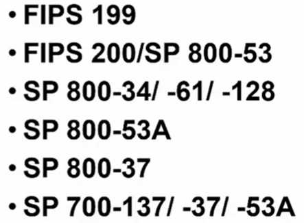여기에는 연방 정보 처리 표준, FIPS 199, 연방 정보 및 정보 시스템의 보안 범주화 표준이 포함된다. 이는 이러한 시스템을 범주화하는 데 사용된다. FIPS 200, 연방 정보 및 정보 시스템에 대한 최소 보안 요구 사항 및 현재 버전 5의 정보 시스템 및 조직에 대한 특별 간행물 800-53로, 보안 및 개인 정보 제어 기능이 사용된다. 이들은 선택 제어 단계에서 사용된다. 800-34, 개정 1, 연방 정보 시스템에 대한 비상 계획 안내서 등 여러 SP가 구현 제어 단계에서 사용된다. SP 800-61, 컴퓨터 보안 사고 처리 안내서, 800-128, 정보 시스템의 보안 중점 구성 관리 안내서가 이어서 있다. 여기에는 SP 800-53A 개정 4, 연방 정보 시스템 및 조직의 보안 및 개인 정보 제어 평가, 효과적인 평가 계획 구축도 포함된다. 이는 평가 제어 단계에서 사용된다. 다음으로, 앞서 설명한 SP 800-37은 위험 평가가 수행되는 공인 시스템 단계에서 사용된다. 마지막으로, 8개의 100-137, 이는 연방 정보 시스템 및 조직의 정보 보안 지속 모니터링이다. 800-37 및 800-53A는 모니터 제어 단계에서도 사용된다.