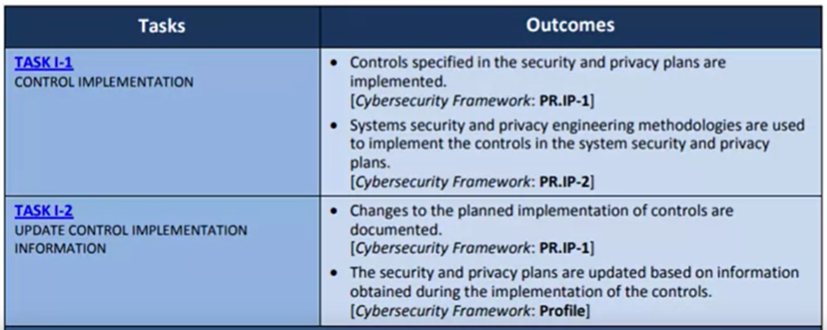 NIST에 따르면 위험 관리 프레임워크의 선택 단계의 산물로 제어가 선택되고 조정된 후 다음 단계는 시스템 보안 및 개인 정보 보호 계획에 따라 제어를 구현하는 것이다. 시스템을 보호하기 위해 제어가 올바르게 구현되고 예상대로 작동하는 것이 중요하며, 구현 단계는 보안 및 개인 정보 보호 제어의 구현에 초점을 맞춘다. 제어의 구현에는 RMF 선택 단계에서 선택된 제어의 의도를 충족하기 위해 새로운 설정 또는 기존 프로세스, 절차, 제품 및 서비스의 활용이 포함된다. 시스템 보안 및 개인 정보 보호 계획은 제어 구현을 위한 지침 역할을 하며 제어가 구현됨에 따라 필요한 경우 업데이트된다.