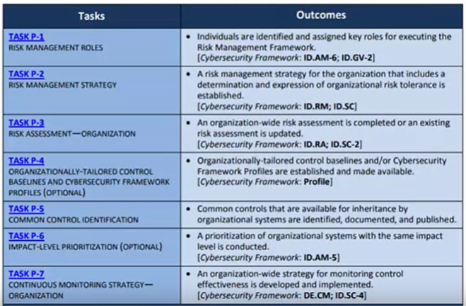 준비 단계의 조직 수준 작업과 결과는 여기에 표시된다. 여기에는 위험 관리 역할 정의, 조직의 위험 관리 전략 수립, 조직 수준 위험 평가 완료 또는 업데이트, 제어 기준선 및 프레임워크 프로파일 설정, 공통 제어 식별, 문서화 및 게시, 조직 시스템의 우선 순위 지정, 제어 효율성 모니터링 전략 개발 및 구현이 포함된다. P-4 및 P-6 작업은 선택 사항으로 여기에 표시된다. P-4 작업은 조직이 조직 전반에 사용할 수 있는 특수화된 제어 세트의 적용 가능성과 필요성을 결정하기 때문에 선택 사항이다. 태스크 P-6은 조직이 영향 지정에서 리소스 할당을 포함한 위험 기반 의사 결정을 용이하게 한다고 판단할 수 있는 사항이다. 여기에는 시스템 수준의 태스크와 준비 단계의 결과가 나와 있다. 여기에는 시스템이 지원해야 하는 프로세스 식별, 주요 이해 관계자 식별, 자산 식별 및 우선 순위 지정, 승인 경계 결정, 시스템이 저장하고 전송하는 정보 프로세스 식별, 시스템 수준 위험 평가 완료 또는 업데이트, 요구 사항 정의 및 우선 순위 지정, 시스템 배치 결정, 시스템 및 환경에 대한 요구 사항 할당, 관리 및 거버넌스를 위한 시스템 등록 등이 포함된다.