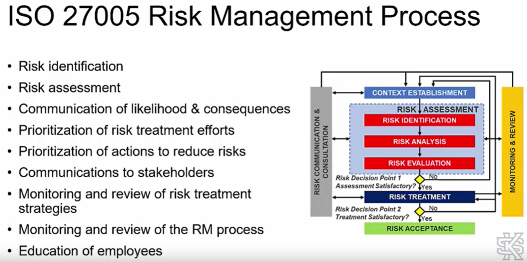 ISO 27005는 주로 위험 관리 프로세스에 초점을 맞추고 ISO 31000에서 볼 수 있는 것 이상으로 그 프로세스를 확장한다. 실제로 이 표준에는 31000에서 제시된 원칙이나 프레임워크가 전혀 언급되어 있지 않다. ISO 27005 접근법은 정보보안 위험 관리가 다음과 같은 위험 식별, 발생 가능성 및 조직에 대한 결과에 기초한 리스크 평가에 기여해야 한다고 명시한다. 이러한 가능성 및 결과에 대한 효과적인 의사소통 및 이해까지 말이다. 그리고 위험 처리 노력의 우선순위 지정, 위험 발생을 줄이기 위한 조치의 우선순위 지정, 이해관계자에 대한 의사소통 및 의사결정 참여, 위험 처리 전략의 모니터링 및 검토의 효과, 위험에 대한 직원의 전반적인 리스크 관리 프로세스 및 교육, 선택된 위험 처리 전략에 대한 효과적이고 정기적인 모니터링 및 검토까지 말이다. ISO 31000에서 추진되는 위험 관리 프로세스는 27005 접근법의 기초가 된다. 정보보안 위험 관리 프로세스는 컨텍스트 구축, 위험 평가, 위험 처리, 위험 수용, 위험 의사소통 및 상담, 위험 모니터링 및 검토로 구성된다. ISO 31000에서 위험 관리 프로세스의 사전 작업으로 범위, 컨텍스트 및 기준을 설명하는 경우, ISO 27005는 컨텍스트만 명시하지만 거의 동일하게 정의한다. 조직의 위험 선호도를 기반으로 따라야 할 특정 흐름을 설명하는 위험 관리 프로세스의 후반 단계에서 추가적인 세부 사항에 주목할 것이다. 이는 위험 평가 및 위험 처리의 일환으로, 위험 결정 지점을 기반으로 프로세스의 루프를 지정하는 IT 전문가와 유사한 흐름도를 제공한다.