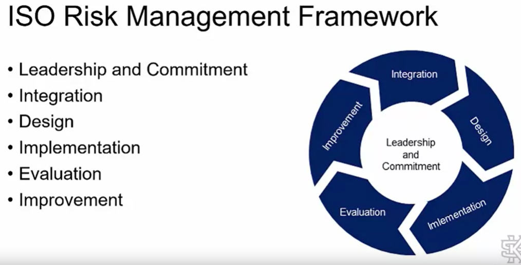 이전의 교훈의 상당 부분이 바탕이 된 ISO 31000 위험관리 프레임워크는 위험관리의 계획 단계로 간주되거나 위험관리 프로세스가 프로세스의 실행 단계로 간주될 수 있다. ISO 31000 위험관리 프레임워크는 리더십과 헌신에 의해 지원되는 5개의 순환 단계를 포함한다. 통합 단계는 위험관리 프로그램이 조직과 비즈니스 수행 방식에 효과적으로 통합되도록 하는 것을 포함한다. 비즈니스 전체가 어떤 형태로든 위험을 수반하므로 비즈니스 전체가 위험관리의 어떤 측면에 관여해야 한다. 이 단계는 위험에 대한 거버넌스와 관리가 조직 운영에 내장되어 있으며, 조직 문화의 일부가 되어야 하는 부분이다. 설계 단계는 조직에 맞춤화된 위험 관리 프로세스를 구축하는 것을 포함한다. 조직의 사회적, 문화적, 정치적, 법적, 규제적, 재무적, 기술적, 경제적, 환경적 요인이 고려된다. 내부 및 외부 이해 관계자도 적절한 경우 고려되고 관련될 수 있을 것이다. 이 단계의 주요 작업에는 조직과 맥락의 이해, 위험 관리 약속 명시, 조직 역할, 권한, 책임 및 책임 할당, 자원 할당, 상담을 위한 의사 소통 및 경로 설정이 포함된다. 실행 단계에는 위험 관리 계획을 개발하고 의사 결정 권한과 프로세스를 명시하며 관련된 모든 사람에게 위험 관리 프로세스를 명확히 하는 것이 포함된다. 평가 단계는 조직이 위험 관리의 측정 및 평가 구성 요소를 설계하는 단계로 다음 단계에서 어떤 정보를 수집하고 사용할 것인지 결정한다. 또한 위험 관리 프로그램이 얼마나 성공적인지 측정하고 무엇이 성공을 정의하는지를 결정한다. 개선 단계는 조직이 이전 단계에서 학습한 것을 취하고 이를 사용하여 위험 관리 프로그램을 더 나은 상태로 만드는 데 사용한다. 조직의 일부로서 위험 관리 수행에 중점을 두면서 프레임워크 팀이 프로세스와 프레임워크 자체를 개선하는 데 사용할 수 있는 정보를 수집하고 보고한다. 이것은 물론 위험 관리의 지속적인 개선 측면이다.