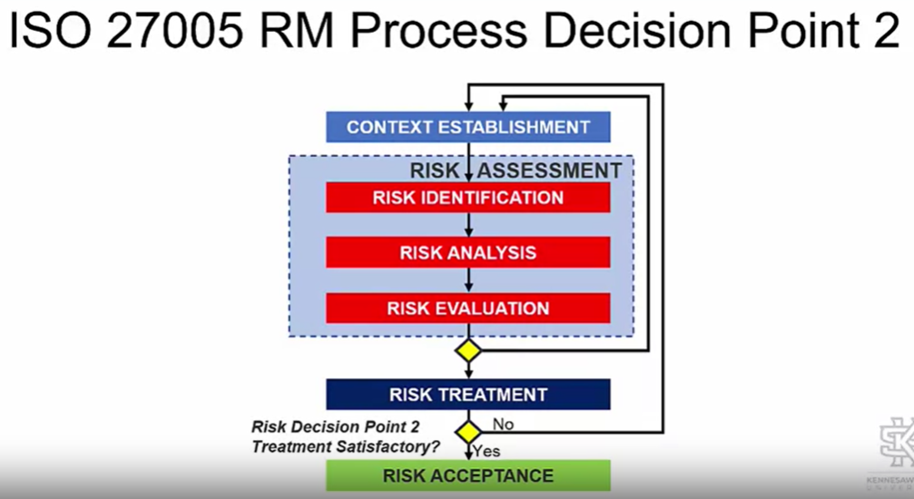 다음 프로세스 수준 결정 지점은 팀이 위험 치료 접근 방식에 만족하는지 여부다. 여기서 조직은 예상되는 가능성 및 영향의 변화를 비교 평가하여 권장되는 위험 치료 전략이 잔여 위험을 조직의 위험 허용 수준보다 낮은 수준으로 줄일 수 있는지 확인할 수 있다. 그렇게 하고 상위 경영진에게 전달하고 승인되면, 다음 자산 또는 자산 집합으로 이동할 수 있다. 그렇지 않으면 다시 위험 처리로 이동하거나 처리 전략을 변경하거나, 전체 위험 관리 프로세스를 처음부터 다시 시작해야 할 것이다. 마지막으로 조직은 위험 수용에 도달한다. 이는 여기서 권장되는 모든 위험 처리 전략을 적용한 후의 위험 수준이다. 조직이 위험 평가 단계에서 위험 수준을 감수할 의사가 있다면, 그들은 두 의사 결정 지점을 모두 빠르게 거쳐 위험 수용으로 이동한 다음 시리즈의 다음 자산으로 이동할 것이다. ISO 표준은 전체적으로 수십 페이지에 불과하며, 전반적으로 간략하지만, 어떻게 해야 하는지보다는 무엇을 수행해야 하는지에 더 중점을 둔다. 독립적인 제3자가 위험 관리 프로그램을 평가한 결과 이 표준을 준수하고 있음을 발견하면, 위험 관리 프로세스가 ISO 27005 또는 ISO 31000을 준수하는지 확인할 수 있다. 마지막으로 프로세스의 마지막에는 관리자가 프로세스 팀의 성과와 성공에 대한 정보를 수집한 후 이를 사용하여 프로세스를 개선하는 모니터링 및 검토 활동이 있다. 물론, 이는 지속적인 개선에 중점을 둔 순환 프로세스다.