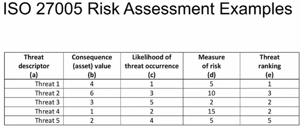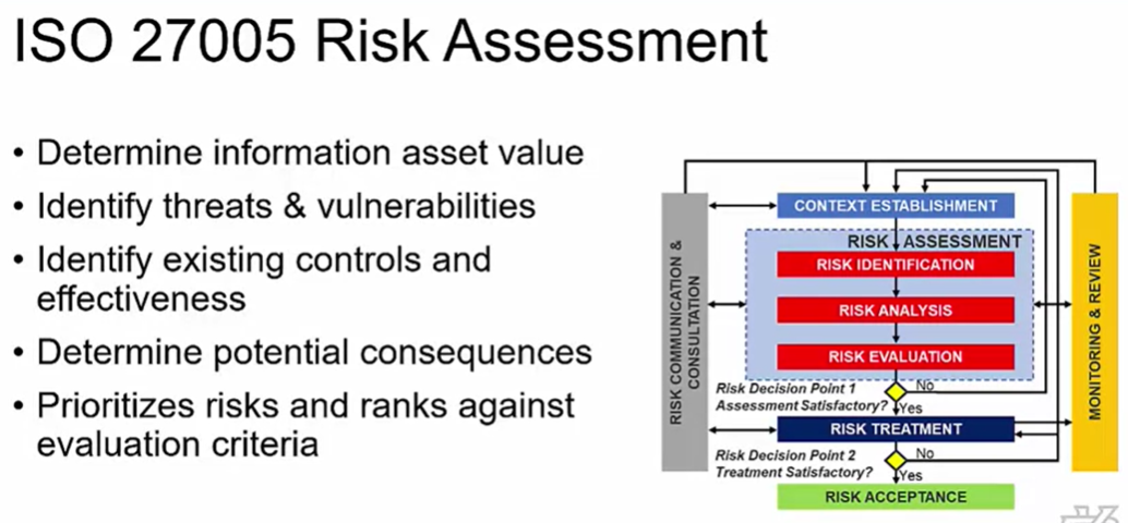 ISO 27005에서 위험 평가는 정보 자산의 가치를 결정한다. 그리고 존재하거나 존재할 수 있는 해당 위협과 취약성을 식별한다. 기존 통제와 식별된 위험에 미치는 영향을 식별한다. 잠재적 결과를 결정하고 마지막으로 도출된 위험의 우선순위를 정하고 상황 수립 단계에서 설정한 위험 평가 기준과 순위를 매긴다. 위험 평가는 종종 두 번 이상의 반복으로 수행된다. 먼저, 높은 수준의 잠재적 위험을 식별하기 위해 높은 수준의 평가가 수행된다. 여기에 추가 평가가 필요하다. 다음으로, 반복은 초기 반복에서 드러난 잠재적으로 높은 위험에 대한 추가 심층적인 고려를 포함할 수 있으며, 여기서 위험을 평가하기에 불충분한 정보를 제공하고, 아마도 전체 범위의 일부에 대해 추가 상세한 분석이 수행되며, 다른 방법을 사용할 수도 있다. 위험 평가에 대한 자체 접근 방식을 선택하는 것은 조직이 목표와 위험 평가의 목적에 따라 결정한다. 위험 평가는 보통 두 번 이상의 반복으로 수행된다.