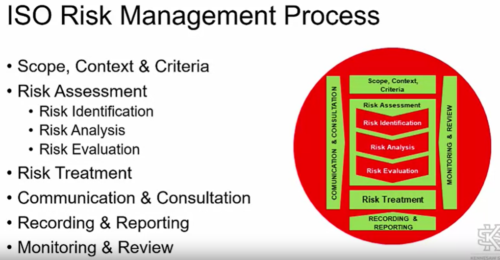 여기에서 볼 수 있듯이 위험 관리 프로세스는 이전 교훈에서 어느 정도 설명했듯이 익숙하게 보여야 한다. 이는 반복적인 프로세스일 뿐만 아니라 지속적으로 개선되는 프로세스다. 그 핵심으로 위험 관리 프로세스는 준비, 위험 평가 및 위험 처리를 포함한다. 범위, 맥락 및 기준 단계에는 위험 관리 프로세스의 범위를 정의하는 것이 포함된다. 무엇을 평가하고 처리할 것인가? 어떤 내부 및 외부 요인을 고려해야 하는가? 위험의 기준은 무엇인가? 허용되거나 허용되지 않는 리스크의 양 및 유형은 무엇인가? 등이다. 이는 본질적으로 조직의 위험 선호도 및 위험 임계값을 프로세스 팀에 전달하는 것이다. 위험 평가에는 세 가지 하위 단계가 포함되며 이 시점에서는 쉽게 이해할 수 있어야 한다. 위험을 찾는 곳에서의 위험 식별, 위험의 성격과 수준을 이해하는 곳에서의 위험 분석, 현재 수준의 위험 허용되는지 또는 처리되어야 하는지 여부를 결정하는 것을 포함하는 리스크 평가인 것이다. 허용되지 않는 것으로 결정된 위험은 마지막 단계인 리스크 처리에 들어간다. 여기서 표준 활동은 앞서 논의한 바와 같이 제3자에게 이전하거나, 위험의 출처를 차단하거나, 추가적인 통제를 적용하여 위험을 줄이거나 제거하는 것이다. 위험 관리 프로세스를 지원하는 기능은 세 가지다. 첫 번째는 의사소통 및 상담이다. 의사소통 및 상담 측면은 프로세스 내, 프로세스 요소와 프레임워크 팀 간, 프로세스 팀과 조직 관리 간에 정보의 지속적인 흐름을 보장한다. 이는 경영진에게 조직의 운영 위험과 관련하여 결정될 사항에 대한 의견을 제공할 기회를 제공하는 동시에 충분한 감독과 거버넌스를 보장한다. 다음으로 기록 및 보고 활동에는 프로세스 팀과 조직 또는 경영진 간의 결과 공유가 포함된다. 또한 지속적인 개선을 위해 모니터링 및 검토 프로세스에서 사용할 수 있는 정보를 수집하는 것도 포함된다. 마지막으로 프로세스의 반대편에는 관리자가 프로세스 팀의 성과와 성공에 대한 수집된 정보를 검토한 다음 이를 프로세스 자체를 개선하는 데 사용하는 모니터링 및 검토 활동이 있다. 이는 물론 반복성과 지속적인 개선에 초점을 맞춘 순환 프로세스다.