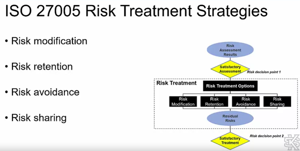 이 표준에서 조직은 여기에 표시된 바와 같이 네 가지 위험 처리 전략 옵션을 가지고 있다. 위험 수정은 잔여 위험을 허용 가능한 것으로 재평가할 수 있도록 통제장치를 도입, 제거 또는 변경함으로써 관리해야 하는 위험 수준이다. 이것이 위험 완화다. 위험 유지는 추가 조치 없이 위험을 유지하는 것에 대한 결정이며, 위험 평가에 따라 조치를 취해야 한다. 이것이 우리가 일반적으로 위험 수용이라고 부르는 것이다. 위험 회피는 특정 위험을 발생시키는 활동 또는 조건이므로 피해야 한다. 이는 인터넷에서 서버의 연결을 끊거나 서비스에서 자산을 완전히 제거하는 것과 같이 위험이 존재하는 환경에서 자산을 제거함으로써 달성할 수 있다. 위험 공유는 위험 평가에 따라 특정 위험을 가장 효과적으로 관리할 수 있는 다른 당사자와 위험을 공유해야 하는 것이다. 여기에는 관리되는 보안 서비스, 조직의 고용 또는 보험 가입과 관련된 위험 전이가 포함된다. 모든 권장 치료 전략을 수행한 후에도 남아 있는 위험은 잔여 위험으로 간주된다.