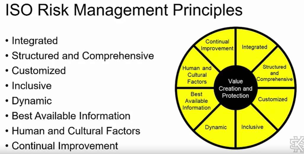 원칙은 효과적이고 효율적인 위험 관리의 특성에 대한 지침을 제공하고 그 가치를 전달하며 그 의도와 목적을 설명하도록 설계되었다. 원칙은 위험 관리를 위한 기반이며 조직의 위험 관리 프레임워크 및 프로세스를 수립할 때 고려해야 한다. ISO에 따르면 이 원칙들은 통합되어 있다. 위험 관리는 조직의 모든 기능과 활동에 통합되어야 한다. 보다 일관되고 비교 가능한 결과를 얻을 수 있도록 구조화되고 포괄적인 형식적 방법론을 사용하여 구조화되고 포괄적이어야 한다. 그리고 맞춤형으로 제공되어야 한다. 위험관리는 각 조직의 내외부 환경에 맞춤형으로 제공되며, 조직의 개별적 임무와 목표에 초점을 맞추어야 한다. 이 역시 포괄적이어야 한다. 위험관리 접근법은 조직의 이해관계자들의 지식, 견해, 인식 등을 포함한 고려를 포함하며, 이는 역동적이어야 한다. 위험관리 접근법은 내부 및 외부 환경의 변화에 따라 적시에 위험의 변화에 따라 진화하고 대응할 수 있다. 이는 최상의 이용 가능한 정보를 기반으로 해야 한다. 또한, 위험관리 접근법은 이용 가능한 정보와 관련된 한계와 불확실성을 고려해야 한다. 가능한 한 조직은 사용하는 정보가 가능한 한 최신이고 정확한지 확인해야 할 것이다. 그리고 인적 및 문화적 요인을 포함해야 한다. 조직 문화뿐만 아니라, 내외부적으로 조직 사람들의 역할도 프레임워크와 프로세스 모두에서 위험관리 접근법에 영향을 미칠 수 있다. 근본적인 지속적인 개선도 필요하다. 위험관리 접근법은 항상 내성과 검토를 통해 위험관리의 성과와 결과를 지속적으로 개선하기 위해 노력해야 한다.